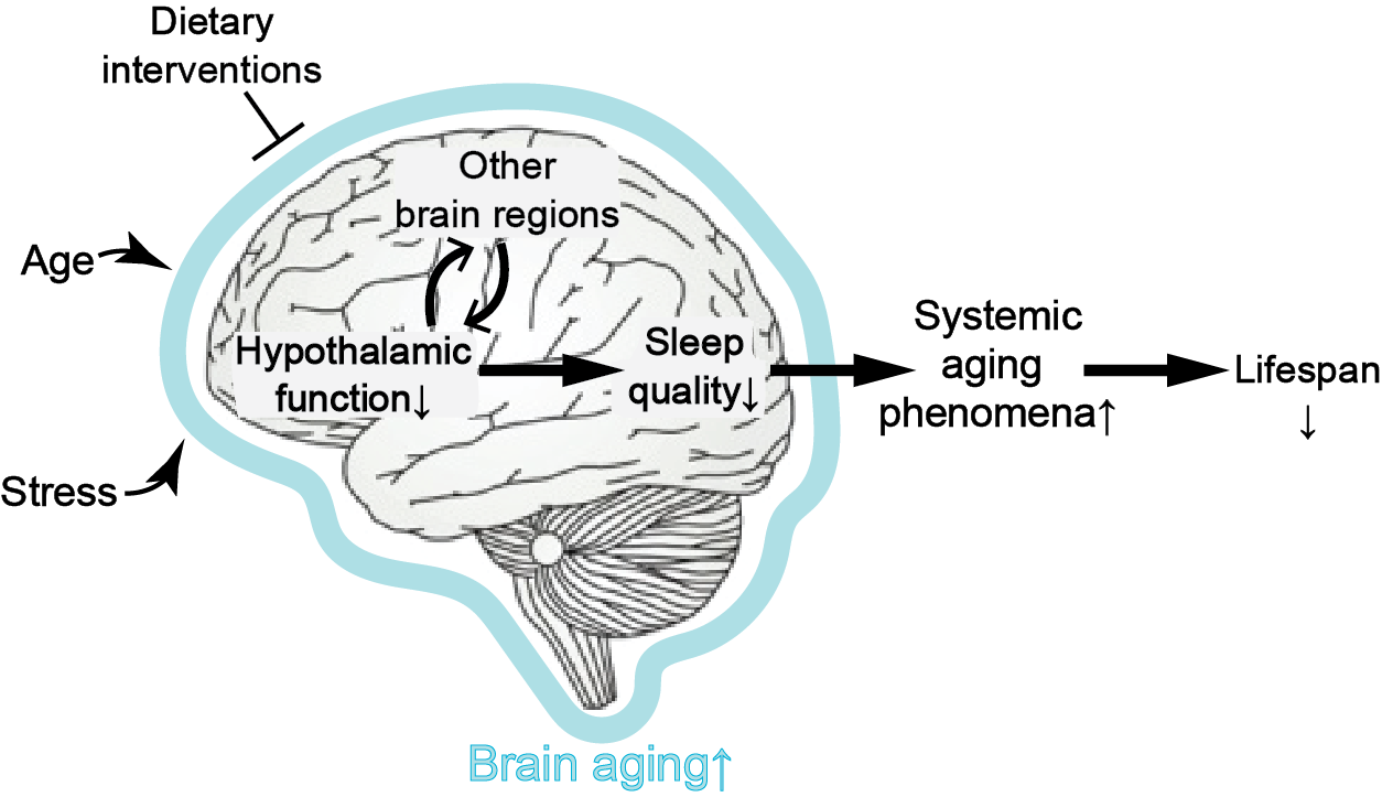 加齢に伴い、脳、特に視床下部機能が低下すると睡眠の質が低下する。また、ストレス負荷も同様に睡眠の質の低下を誘導する。また、視床下部の機能低下は他の脳領域を含む脳の機能的ネットワークの異常を引き起こす。その結果、全身の老化現象が誘導され、最終的に哺乳類の寿命に影響が及ぼされる。食餌制限などの栄養学的介入は老化に伴う睡眠の質低下を抑制することが老化現象の遅延や寿命延伸作用につながるのかもしれない。つまり加齢に伴う睡眠変化は個体寿命を決定しうる脳老化の現象の一つであることが考えられる。