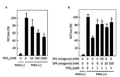 "Upon stimulation, neutrophils release their nuclear contents called neutrophil extracellular traps (NETs), which contain unfolded chromatin and lysosomal enzymes. NETs have been demonstrated to play a critical role in host defence, although the role of PGE2, a bioactive substance generated in inflammatory tissues, in the formation of NETs remains unclear.The effects of PGE2, agonists and antagonists of its receptors, andmodulators of the cAMP–PKA pathway on the formation of NETswere examined in vitro in isolated neutrophils and in vivo in a newly established mouse model.PGE2 inhibited PMA-induced NET formation in vitro through EP2 and EP4 Gαs-coupled receptors. Incubation with a cell-permeablecAMP analogue, dibutyryl cAMP, or various inhibitors of a cAMP-degrading enzyme, PDE, also suppressed NET formation. In the