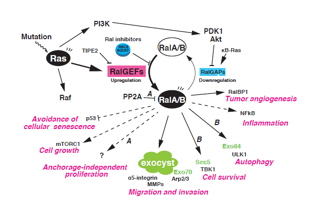 "The Ral GTPases, RalA and RalB, are members of the Ras superfamily of small GTPases. Research on Ral GTPases and their functions over the past 25 years has revealed the essential involvement of these GTPases in unique and diverse cellular processes including exocyst-mediated exocytosis and related cellular activities. Moreover, it is increasingly appreciated that the aberrant activation of Ral GTPases is one of the major causes of human tumorigenesis induced by oncogenic Ras. Recent evidence suggests that Ral signaling pathways may be potential therapeutic targets for the treatment of human cancers."