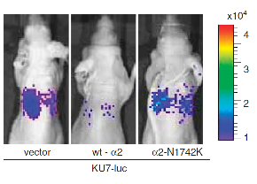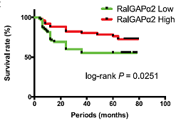 "The small GTPase Ral is known to be highly activated in several human cancers, such as bladder, colon and pancreas cancers. It is reported that activated Ral is involved in cell proliferation, migration and metastasis of bladder cancer. This protein is activated by Ral guanine nucleotide exchange factors (RalGEFs) and inactivated by Ral GTPase-activating proteins (RalGAPs), the latter of which consist of heterodimers containing a catalytic a1or a2 subunit and a common b subunit. In Ras-driven cancers, such as pancreas and colon cancers, constitutively active Ras mutant activates Ral through interaction with RalGEFs, which contain the Ras association domain. However, little is known with regard to the mechanism that governs aberrant activation of Ral in bladder cancer, in which Ras mutations are relatively infrequent. Here, we show that Ral was highly activated in invasive bladder cancer cells due to reduced expression of RalGAPa2, the dominant catalytic subunit in bladder, rather than increased expression of RalGEFs. Exogenous expression of wild-type RalGAPa2 in KU7 bladder cancer cells with invasive phenotype, but not mutant RalGAPa2-N1742K lacking RalGAP activity, resulted in attenuated cell migration in vitro and lung metastasis in vivo. Furthermore, genetic ablation of Ralgapa2 promoted tumor invasion in a chemically-induced murine bladder cancer model. Importantly, immunohistochemical analysis of human bladder cancer specimens revealed that lower expression of RalGAPa2 was associated with advanced clinical stage and poor survival of patients. Collectively, these results are highly indicative that attenuated expression of RalGAPa2 leads to disease progression of bladder cancer through enhancement of Ral activity." (Saito et al, Oncogene, 2013)