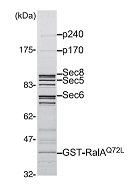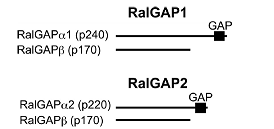 teins regulating a variety of cellular processes. Like other GTPases, the activity of Ral is regulated by the opposing effects of guanine nucleotide exchange factors (GEFs) and GTPase-ac- tivating proteins (GAPs). Although several RalGEFs have been identified and characterized, the molecular identity of RalGAP remains unknown. We reported the first molecular identification of RalGAPs, which we have named RalGAP1 and Ral- GAP2. They are large heterodimeric complexes, each consisting of a catalytic α1 or α2 subunit and a common β subunit. These RalGAP complexes share structural and catalytic similarities with the tuberous sclerosis tumor suppressor complex, which acts as a GAP for Rheb. In vitro GTPase assays revealed that recombinant RalGAP1 accelerates the GTP hydrolysis rate of RalA by 280,000-fold. Heterodimerization was required for this GAP activity. In PC12 cells, knockdown of the βsubunit led to sustained Ral activation upon epidermal growth factor stimulation, indicating that the RalGAPs identified here are critical for efficient termination of Ral activation induced by extracellular stimuli. Our identification of RalGAPs will enable further understanding ofRal signaling in manybiological and pathological processes." (Shirakawa et al, J Bio Chem, 2009)