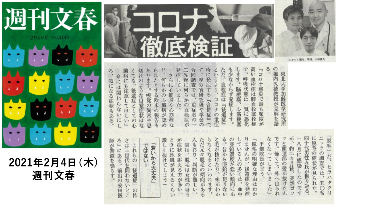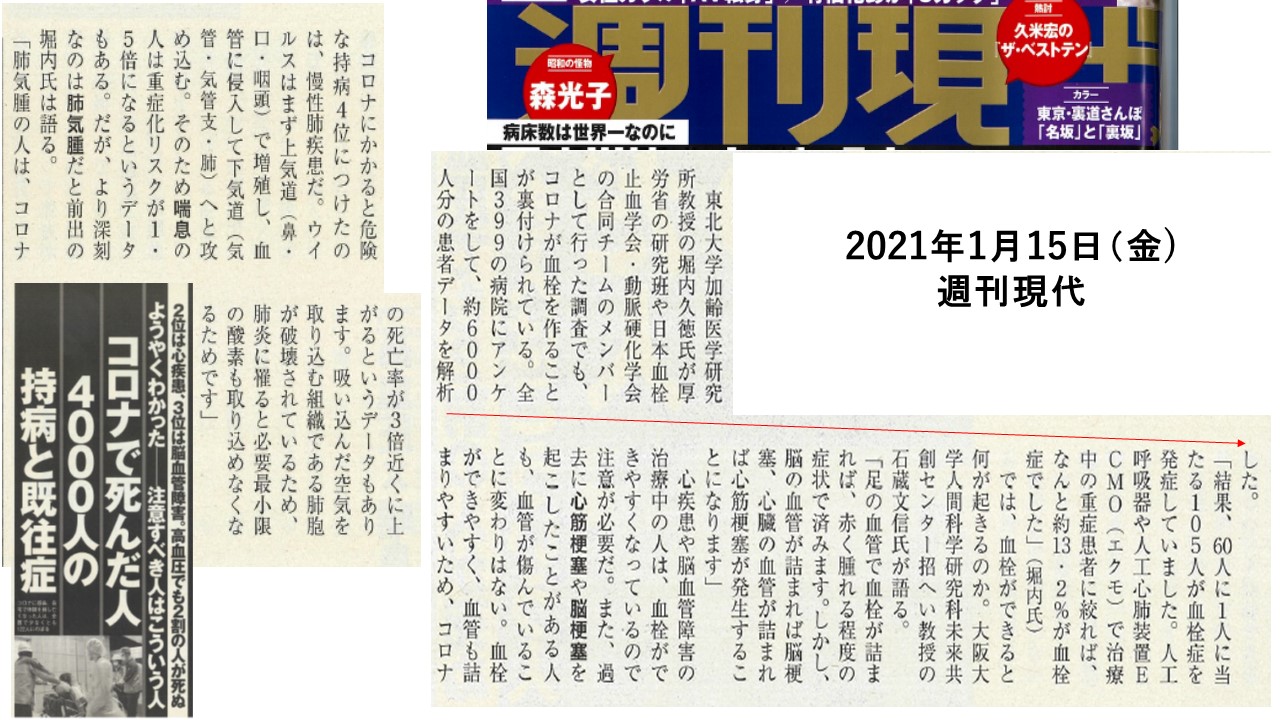 - 堀内久徳ほか厚生労働省難治性疾患政策研究事業血液凝固異常症等に関する研究班、日本血栓止血学会、日本動脈硬化学会合同チームが、2020年8月31日までに入院したCOVID-19患者(全国399病院)を対象とした血栓症アンケート調査を実施。調査結果報告はこちら
