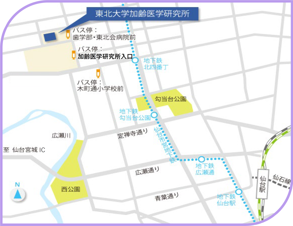 仙台駅西口バスプール9番のりばから899系統「東北大学病院経由 子平町・北山循環」に乗車(約15分)、加齢医学研究所近隣バス停(加齢医学研究所入口、歯学部・東北会病院前、星陵町)下車、徒歩約5分。