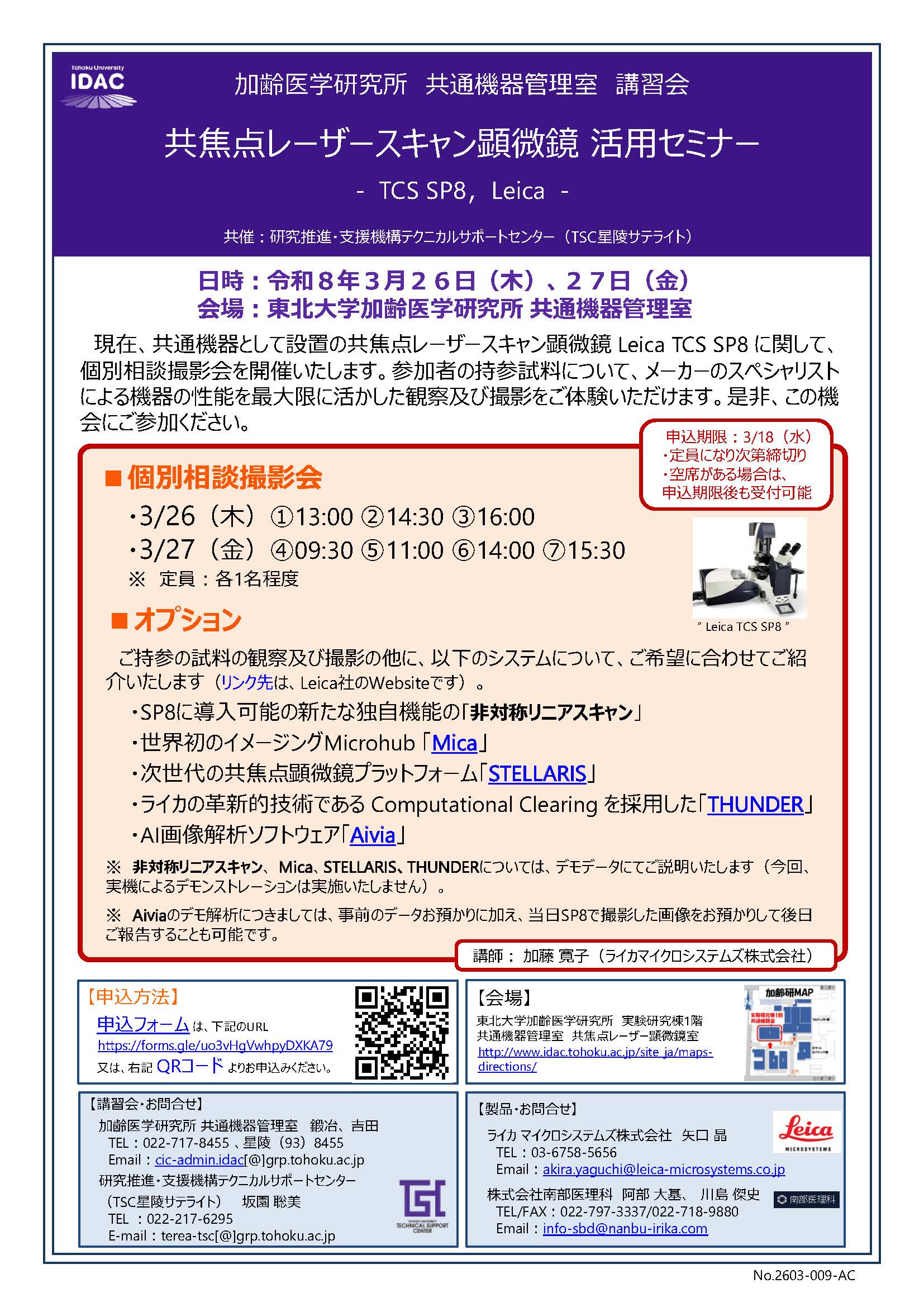 | 問合せ先 | 加齢医学研究所 共通機器管理室 鍛冶、吉田 E-mail: cic-admin.idac[@]grp.tohoku.ac.jp Phone: 022(717)8455、内線:(93)8455 |