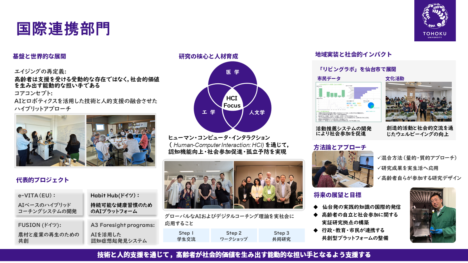 AIと人的支援を融合したハイブリッドアプローチのもと,医学・工学・人文学にわたるHCI研究を推進し,国際プロジェクト・共同研究を通じて高齢者が社会的価値を生み出す担い手となることを目指す