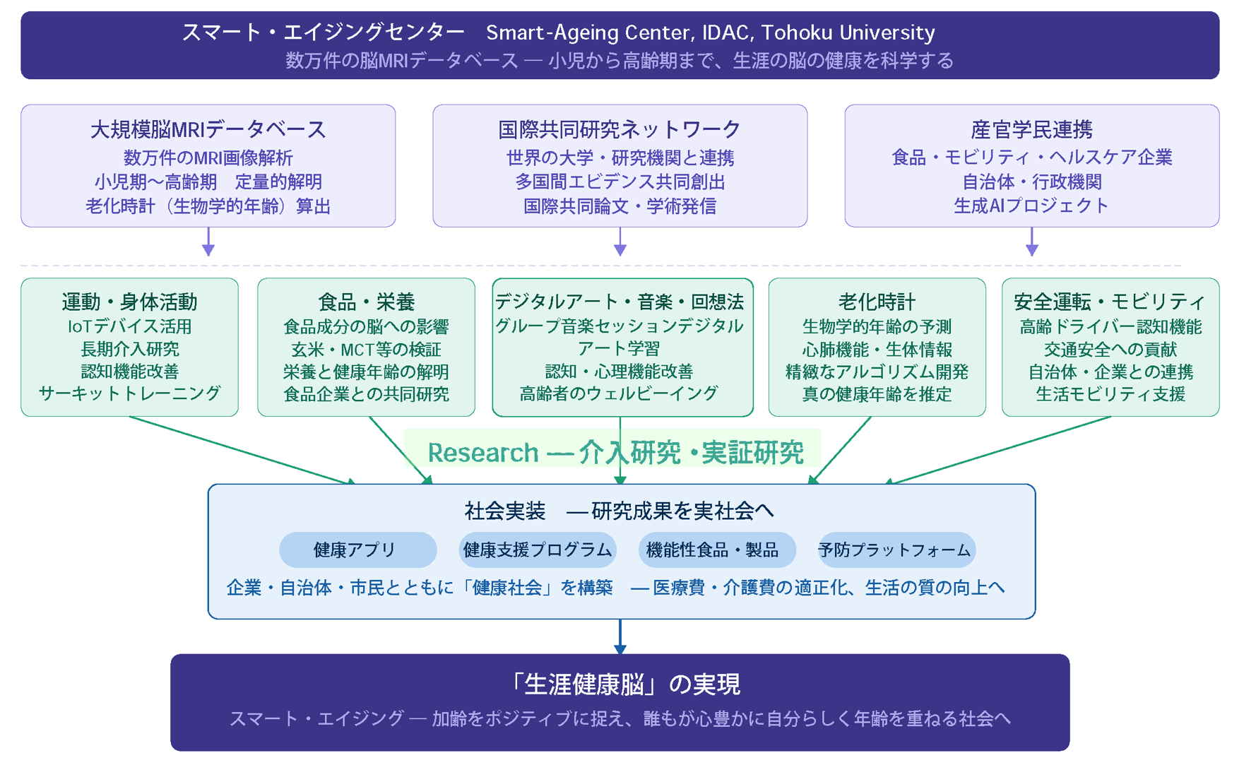・国際共同研究ネットワークでグローバルにエビデンスを創出 — 世界の研究機関と連携し、誰もが心豊かに年齢を重ねていく「スマート・エイジング」を究極の目標(理念)に、個別最適化された方法で「生涯健康脳」を実現